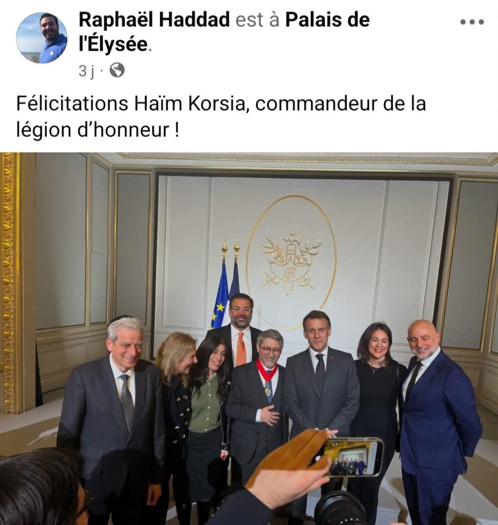 (Basé sur la publication de Raphaël Haddad sur Facebook, créditée comme publique) est le suivant : Raphaël Haddad est au Palais de l’Élysée.