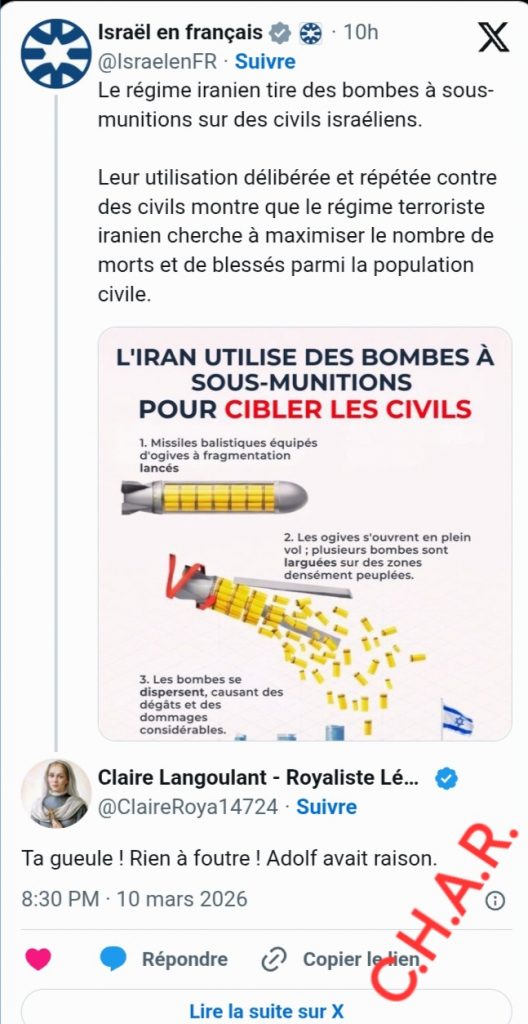 Le 10 mars 2026, sous un post officiel israélien dénonçant des attaques iraniennes à sous-munitions contre des civils, l’utilisatrice @ClaireRoya14724