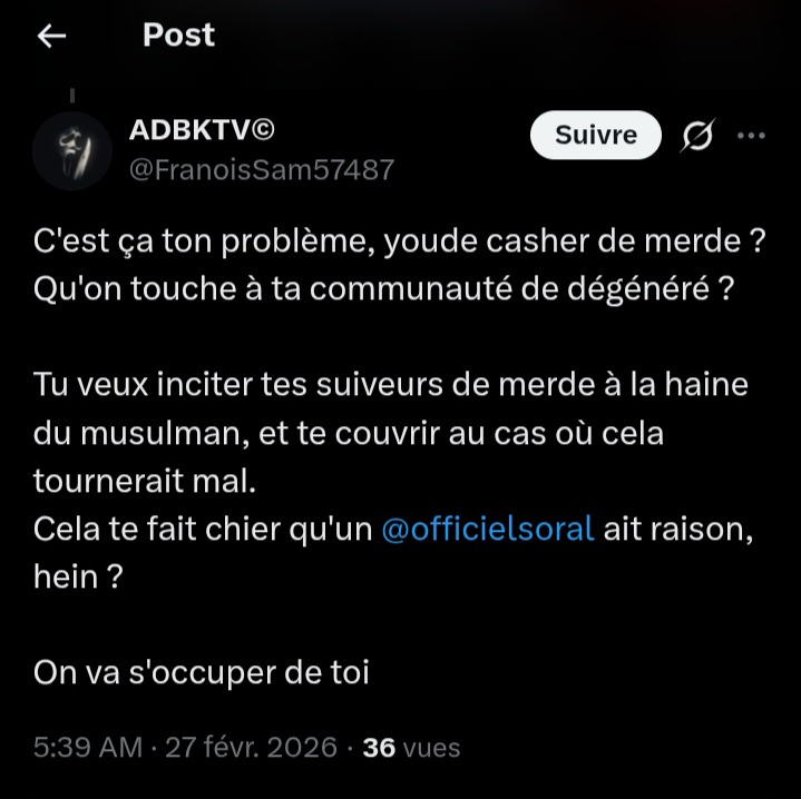 Propos : » C’est ça ton problème, youde casher de merde ? Qu’on touche à ta communauté de dégénérés ? Tu veux inciter tes suiveurs de merde à la haine du musulman, et te couvrir au cas où cela tournerait mal. […] On va s’occuper de toi « .