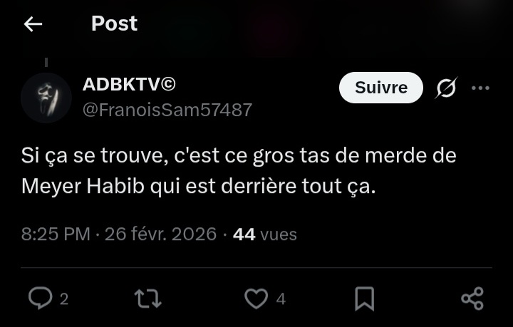 Accusation complotiste impliquant Meyer Habib comme responsable caché d’un événement ou d’une situation (« derrière tout ça »).