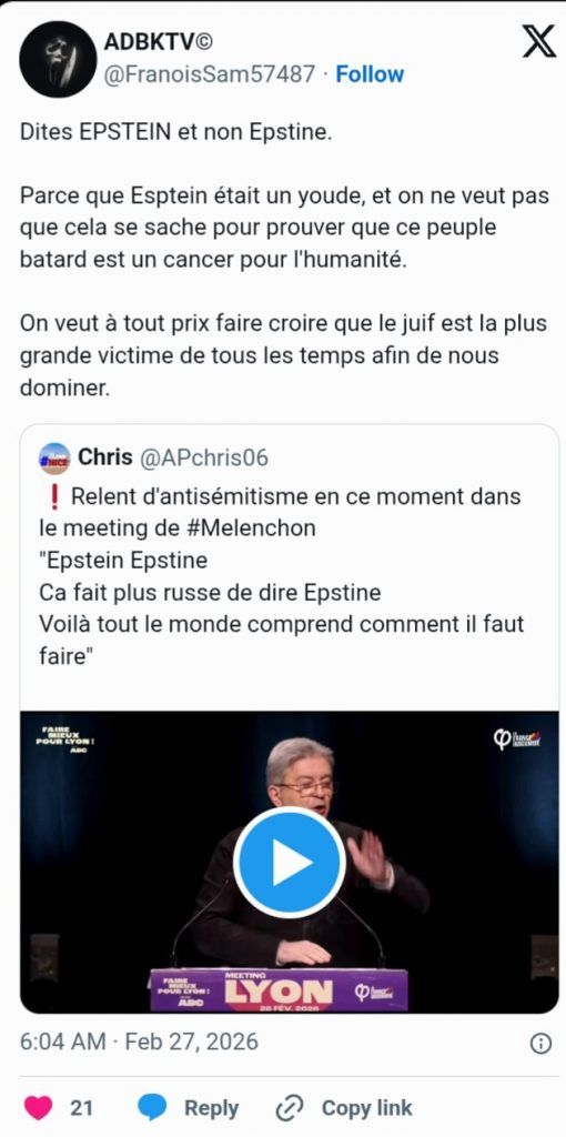 Ces posts illustrent un pattern clair : utilisation récurrente de termes comme « youde » ,essentialisation des Juifs à partir de figures criminelles (Epstein, etc.), insultes, menaces, et théories complotistes anti-juives