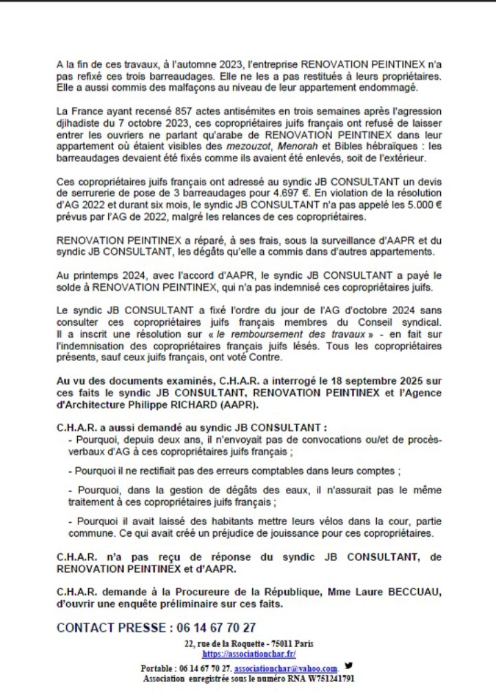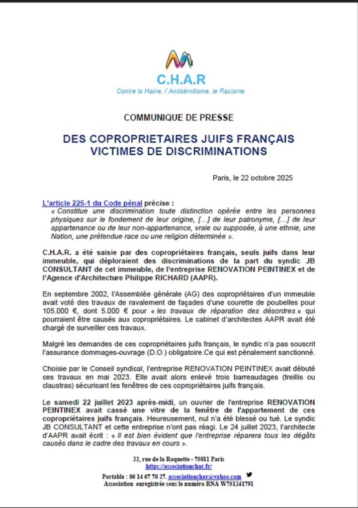C.H.A.R. a été saisie par des copropriétaires français, seuls juifs dans leur immeuble, qui déploraient des discriminations de la part du syndic JB CONSULTANT de cet immeuble, de l’entreprise RENOVATION PEINTINEX et de l’Agence d’Architecture Philippe RICHARD (AAPR).