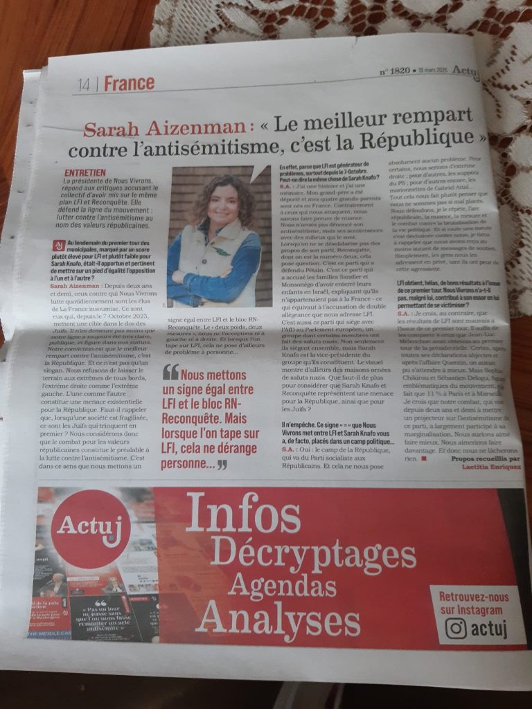 L’article est titré : « Sarah Aizenman : « Le meilleur rempart contre l’antisémitisme, c’est la République » ». Il traite notamment de la position du mouvement vis-à-vis de La France Insoumise (LFI) et du bloc RN-Reconquête au lendemain d’élections municipales.