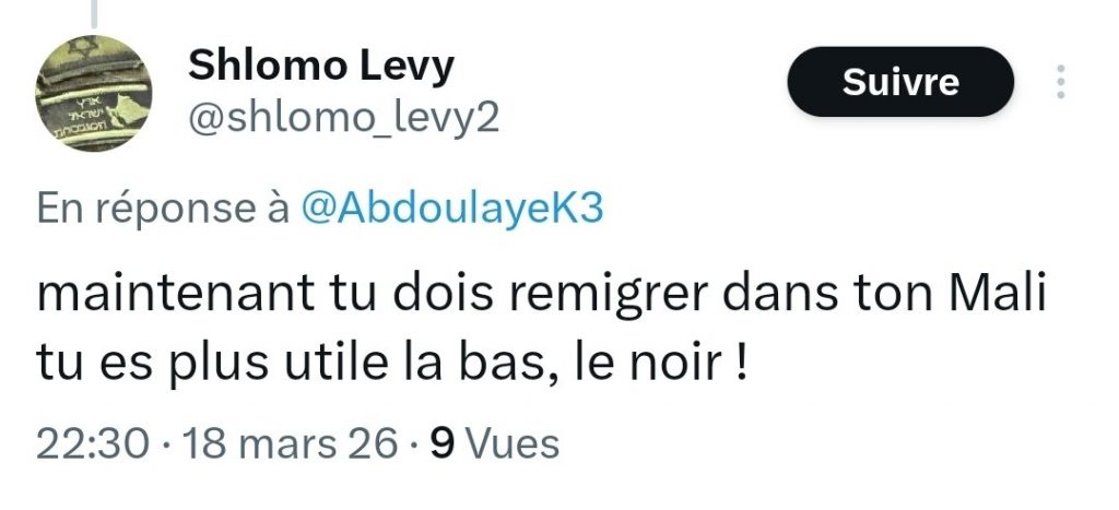 Un compte X (ex-Twitter) fraîchement créé, dont le profil arbore une identité juive ou israélienne, commence à publier des messages ouvertement racistes et haineux contre les Noirs.