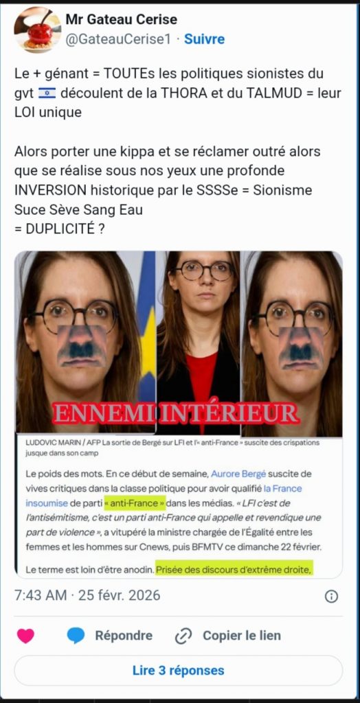 Le compte @GateauCerise1 publie des montages ignobles : des photos d’Aurore Bergé affublée d’une moustache hitlérienne, associées à des accusations de « lobbyistes pro-sionistes » et de « trahison ».