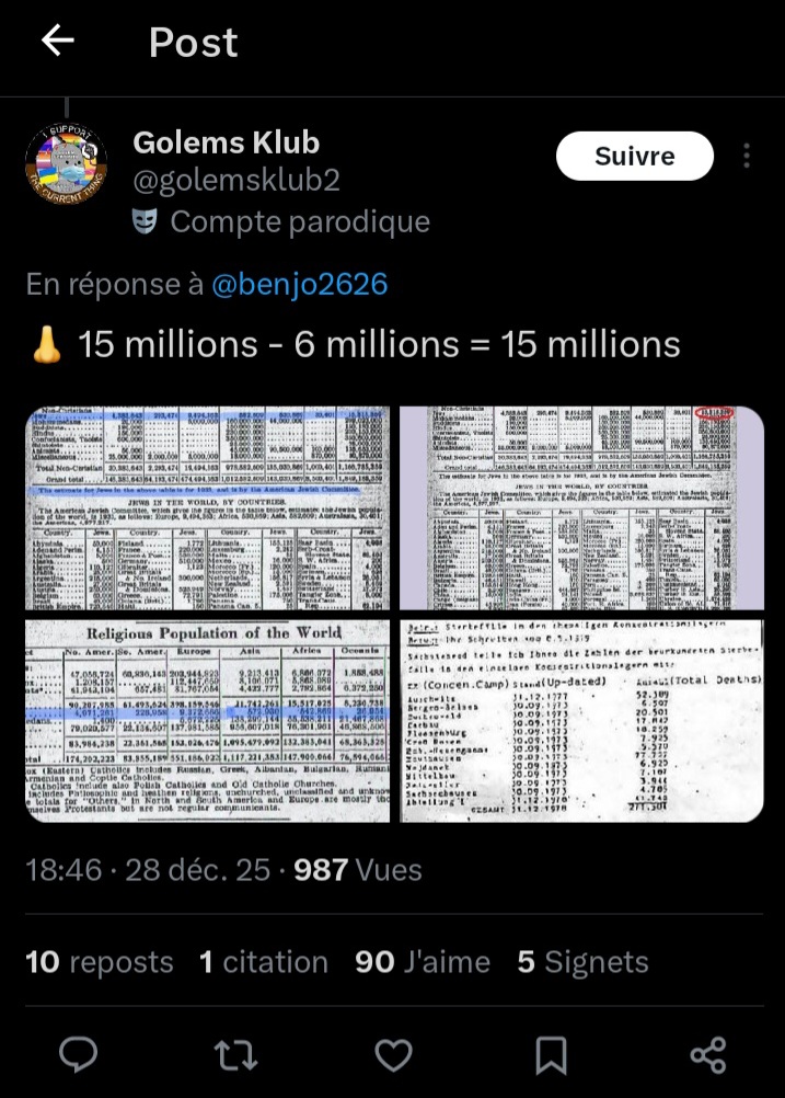 Problématique : Ironie/négationnisme sur le chiffre « 6 millions » (victimes de la Shoah), utilisé pour moquer l’antisémitisme.