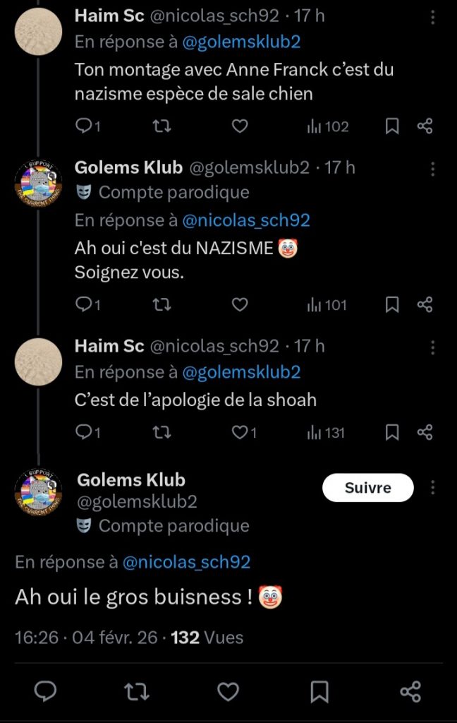 Après l’attaque violente d’une école juive à Paris (vitres éclatées, plaque arrachée, caméra détruite) le 1er février 2026, le compte a ironisé : « Quasiment la shoah ! Quelle horreur bichette ! » — une moquerie directe d’un acte antisémite réel.
