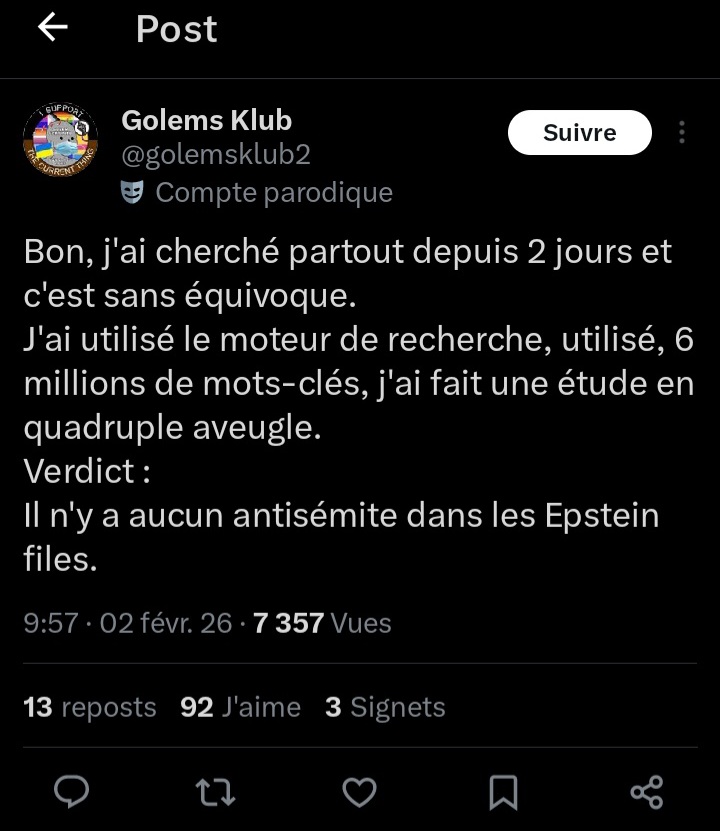 Citation : « Bon, j’ai cherché partout depuis 2 jours […] utilisé, 6 millions de mots-clés […] Il n’y a aucun antisémite dans les Epstein files. »